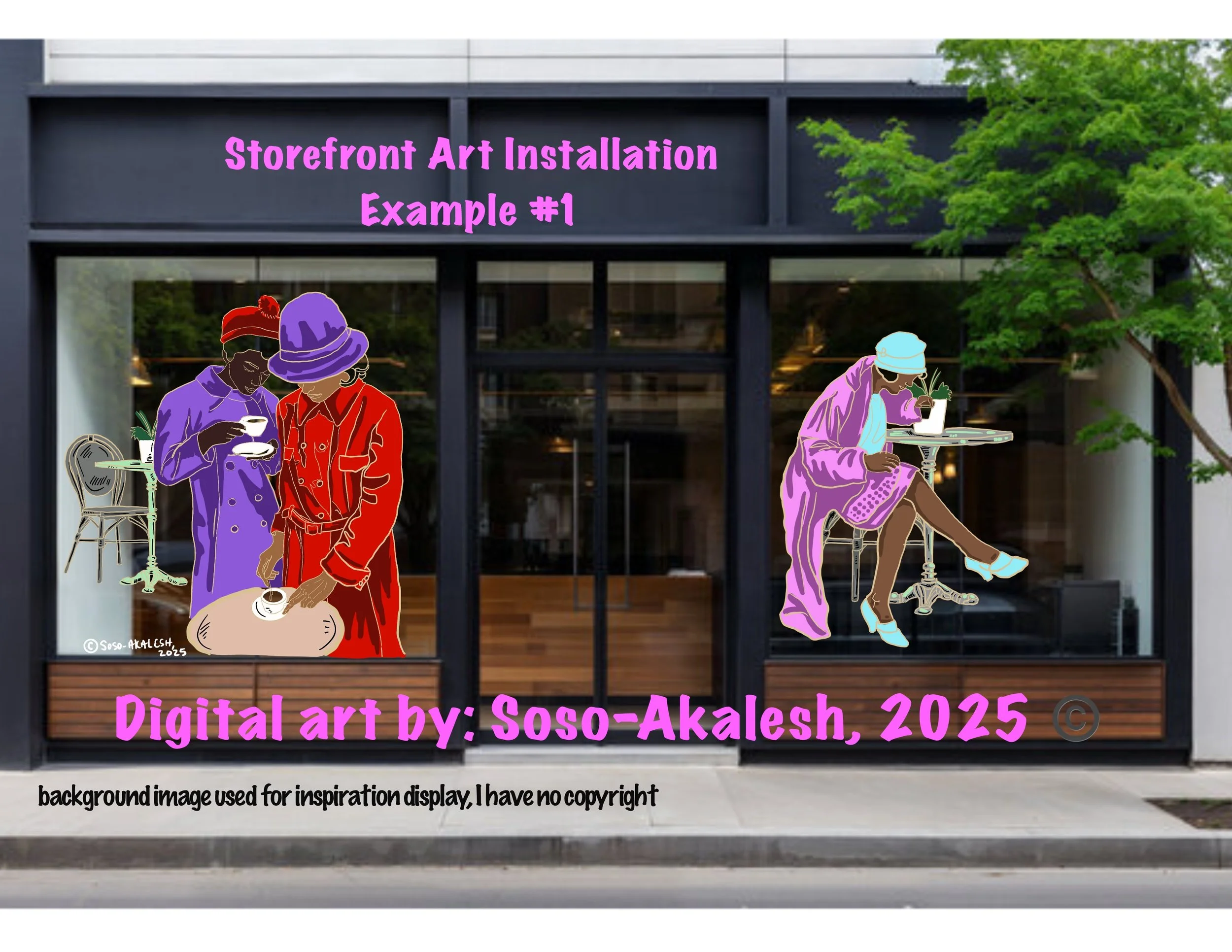Artist Soso-Akalesh has professional creativity skills to bring your storefront windows with unique and vibrant artistic style! She works with the client’s ideas and the establishment organic flow!